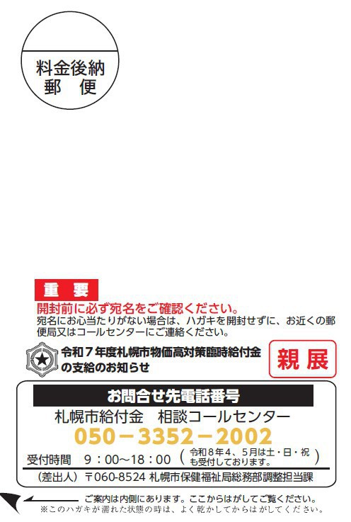 向居住在札幌市的居民发放“令和7年度札幌市物价高对策临时补助金”。