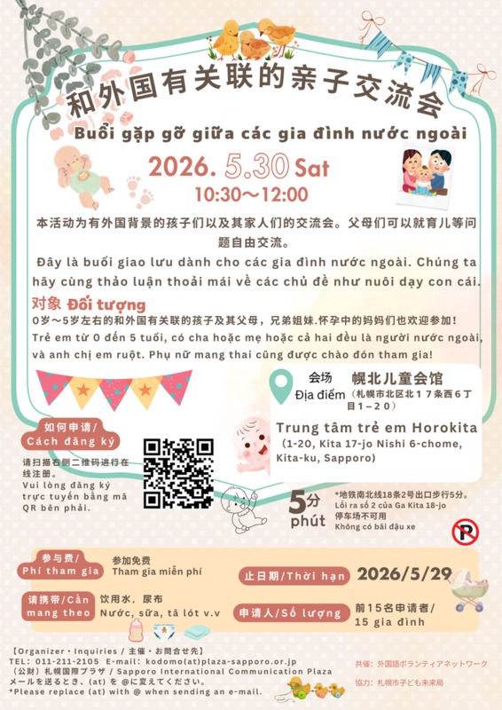 如果您正在札幌养育孩子,想参加各区的面向0岁至上学前儿童的育儿沙龙却苦于语言障碍,札幌国际交流中心的外国语志愿者会帮您免费翻译(仅限日英翻译。)!