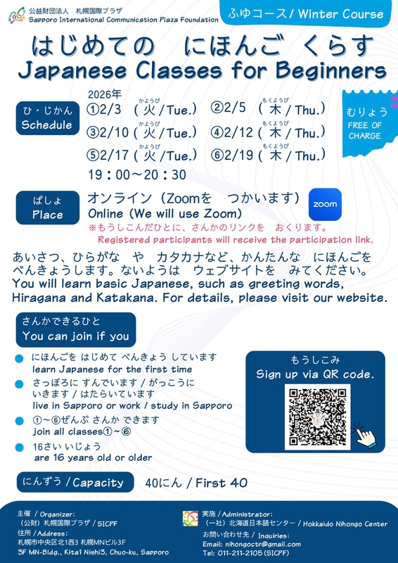 There are many Volunteers’ Japanese Classes in Sapporo. Check the list below for their locations, class hours, and fees, which vary from class to class. This information is as of April, 2025. Contents may be subject to change. Questions should be directed to each school.Please also see Sapporo Japanese Language Classes Map(Japanese and English).