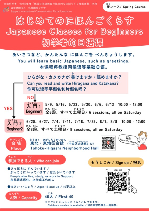 삿포로 시내에는 많은 일본어 자원봉사 교실이 있습니다. 각각 시간, 장소, 요금이 다르기 때문에 일람에서 확인해 주십시오. 본 정보는 2025년 4월 기준의 정보입니다. 내용이 변경될 수 있습니다.궁금한 점이 있으면 각 교실로 직접 연락해 주십시오. 삿포로일본어교실MAP도 함께 참고하시기 바랍니다.