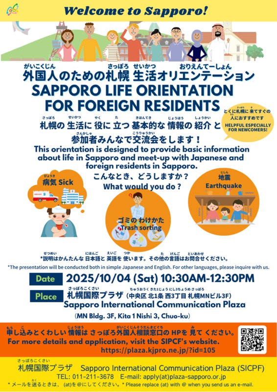 ※ Nội dung buổi hướng dẫn dành cho đối tượng người nước ngoài mới đến Sapporo, tuy nhiên chúng tôi cũng rất hoan nghênh sự tham gia của những người đang sống ở Sapporo muốn đến giao lưu, chia sẻ.