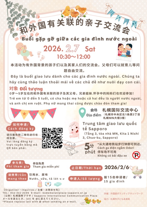 Tổ chức giao lưu quốc tế Sapporo đang tổ chức các hội thảo và buổi tư vấn dành cho người nước ngoài đang nuôi dạy trẻ tại Sapporo.